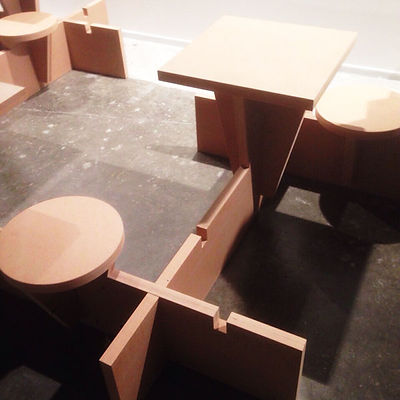 Através de módulos combináveis, este móvel vai criando um volume crescente de peças que atendem a necessidade do sentar, apoiar, se reunir. Permite variações de mesas e bancos e foi construído em MDF, mas admite a variedade de materiais. A sustentação se dá pelo próprio encaixe, sendo de fácil montagem e desmontagem.