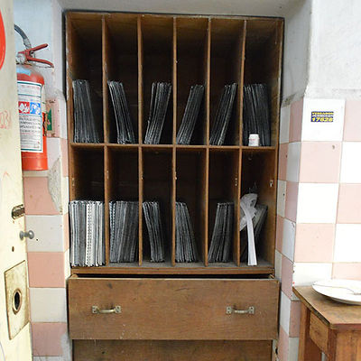 Esse foi encomendando pelo telefone para o marceneiro do interior de Pernambuco que fez outros móveis de uma pequena gráfica no centro da cidade. O dono mandou as medidas e disse como queria preencher um espaço vago. Na parte de cima, uma estante onde se guardam atualmente chapas usadas no processo de impressão em offset. Embaixo, gavetas largas para outros objetos.